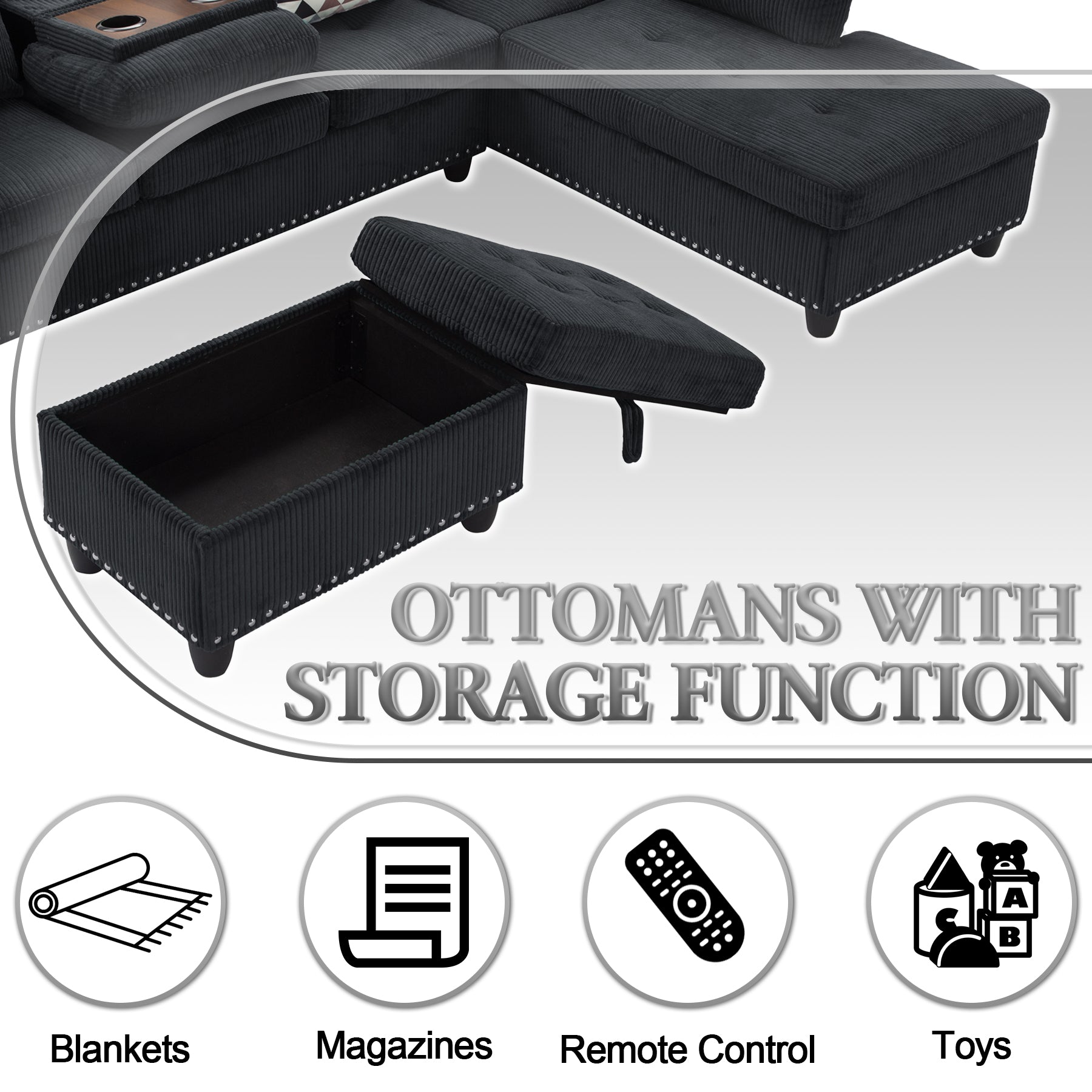 - 【Movable Couch Ottoman】:L-Shaped Corduroy Sofa with Movable Ottoman - Customize as sectional, loveseat or chaise. Plush cushions & minimalist design suit living rooms, bedrooms or offices.